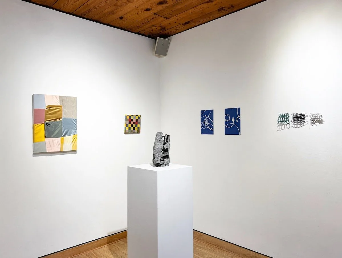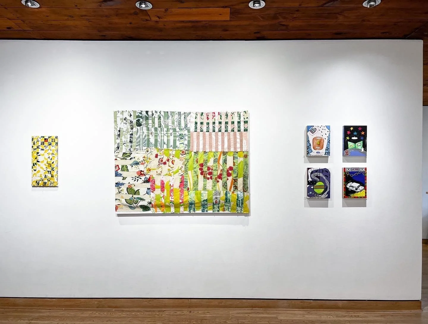Installation view. From the left: Lemon Spice, Helen Sharpless. Flag Dude, Helen Sharpless. A Gathering, The thing with Space is, and Feel Like by Cynthia Giron. Photo: Amanda Powers.