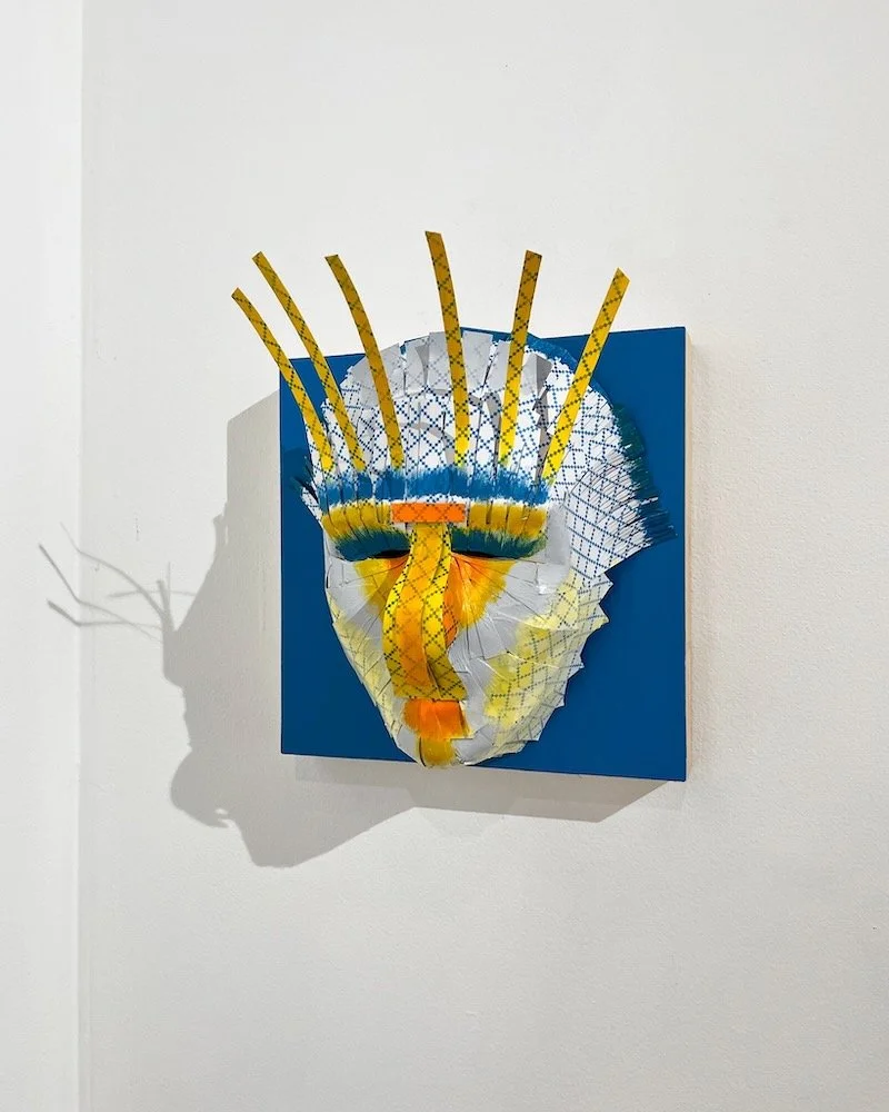 Hugo Pérez’s Loteria card masks frame the back doorway. Tezcatlipoca (Moon God) rises from the left, and Huitzilopochtli (Sun God) sets on the right. During the pandemic, Pérez hosted a small mask-making workshop for his close friends as way of reclaiming the masks they were wearing every day to protect themselves. Prompted by this exhibition, Pérez created a set of masks using Loteria cards which reminded him of his childhood and cultural background. The masks, one depicting the Sun God and at other the Moon God represent duality–a concept Pérez continues to explore in his practice.