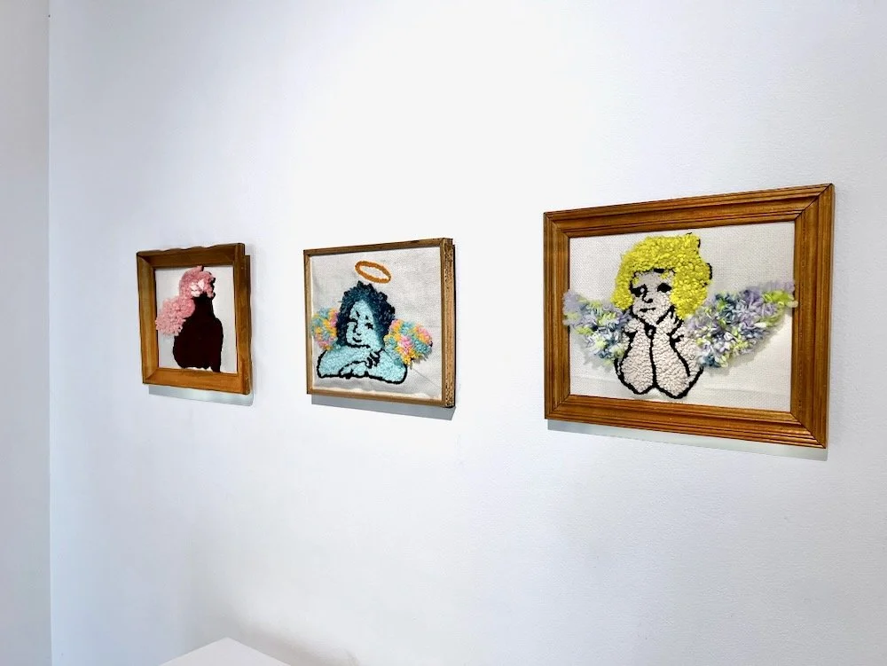 Lorena Mitchell, The Lonely Cherubs: Apathy, Boredom and Relief, 2022, Punch needle, 8 x 10 in each. Photo: Amanda Powers.