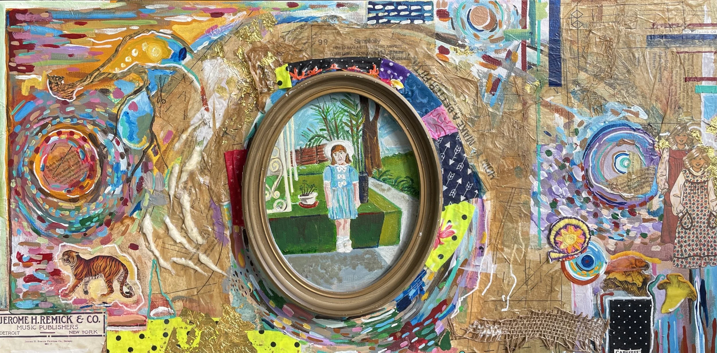 The exhibition returns from expansive to personal narrative with Rachel Toombs’s Bread Crumbs: On the Path Home. A young girl, somewhat timid, stands surrounded by an antique frame centered in the middle of an array of mixed media pieces. A slew of fabric, layered materials, and color circle outside the frame. Bread Crumbs presents the artist’s journey back to herself. Collage became Toombs’s primary practice early in the pandemic. Cutting and layering, Toombs pieced together a personal narrative with play and spontaneity.