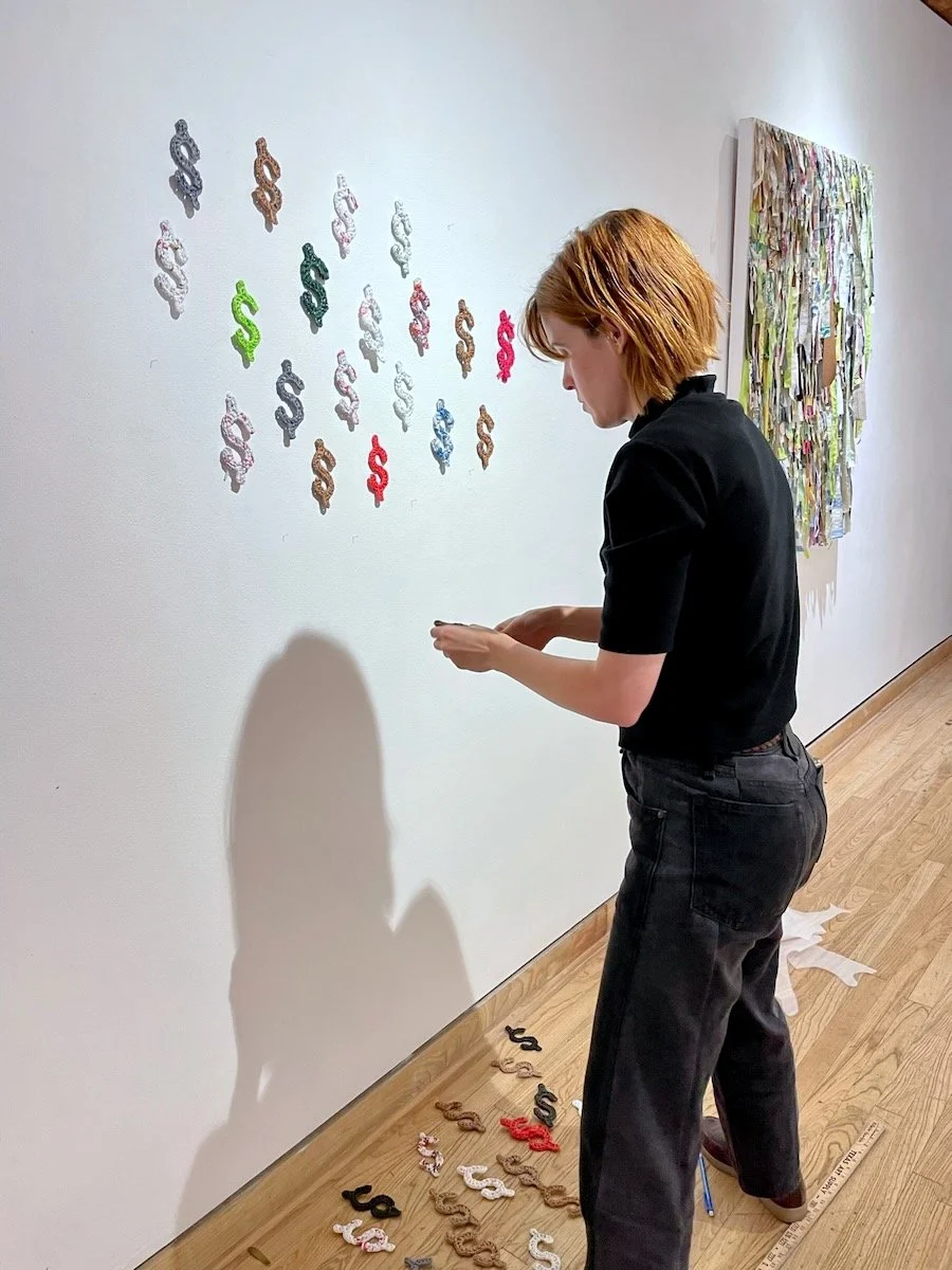 $2/hour is an ongoing series by Powers. Using the craft technique of crochet, Powers loops together dollar signs from plastic bags–producing at most two per hour. During the pandemic, Powers was particularly concerned with the systems of power present in today’s global society and the social and environmental impact of our everyday actions. Transforming “trash to treasure” the objects evoke a since of resistance and communal empowerment against corporate negligence, while simultaneously questioning the value of money, the impact of over-consumption, and the individual’s role within the economic systems of society.