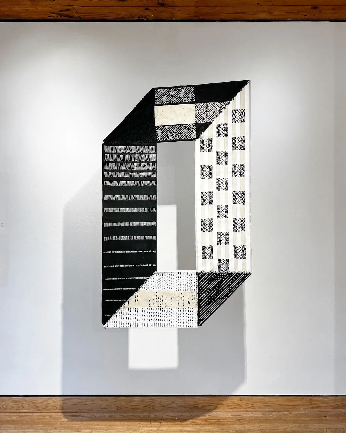 Hanging from the ceiling is a large graphic textile titled Separately Together. Six scraps of canvas are sewn together to create a “0” shaped flag. It is a bold yet meticulous collaboration. Positioned off the wall, the flag creates a dramatic shadow.