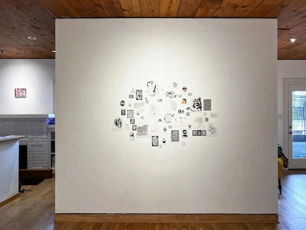 In the following room, Hillaree Hamblin’s microscopic ink drawings expand outwards on the middle wall. Intricate and detailed, these line and dot drawings reflect the manic, yet beautiful, anxiety resulting from isolation and uncertainty. Like a cloud, they suspend themselves.