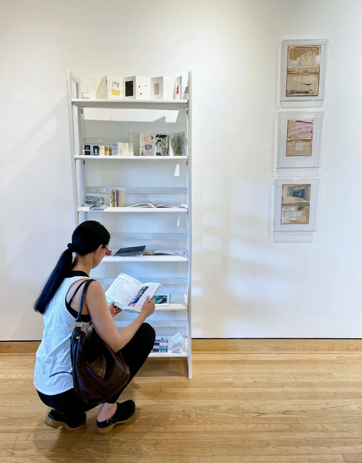 The book shelves host Open Library, a collection of artists’ books made by the Open MFA community. In April 2022, I hosted three artists’ books events with Open MFA. At these events, I introduced the medium and encouraged artists to think about their experiences of home and community during the past two years. We then began making books–either collaboratively or independently. Intimate and narrative in nature, these books, brought together, create a collective history and reflect the community’s perseverance, spontaneity, and willingness to find joy. In contrast to the digitally mediated platforms we have come to depend on, this collection is a physical and tangible connection to shared and personal memory.